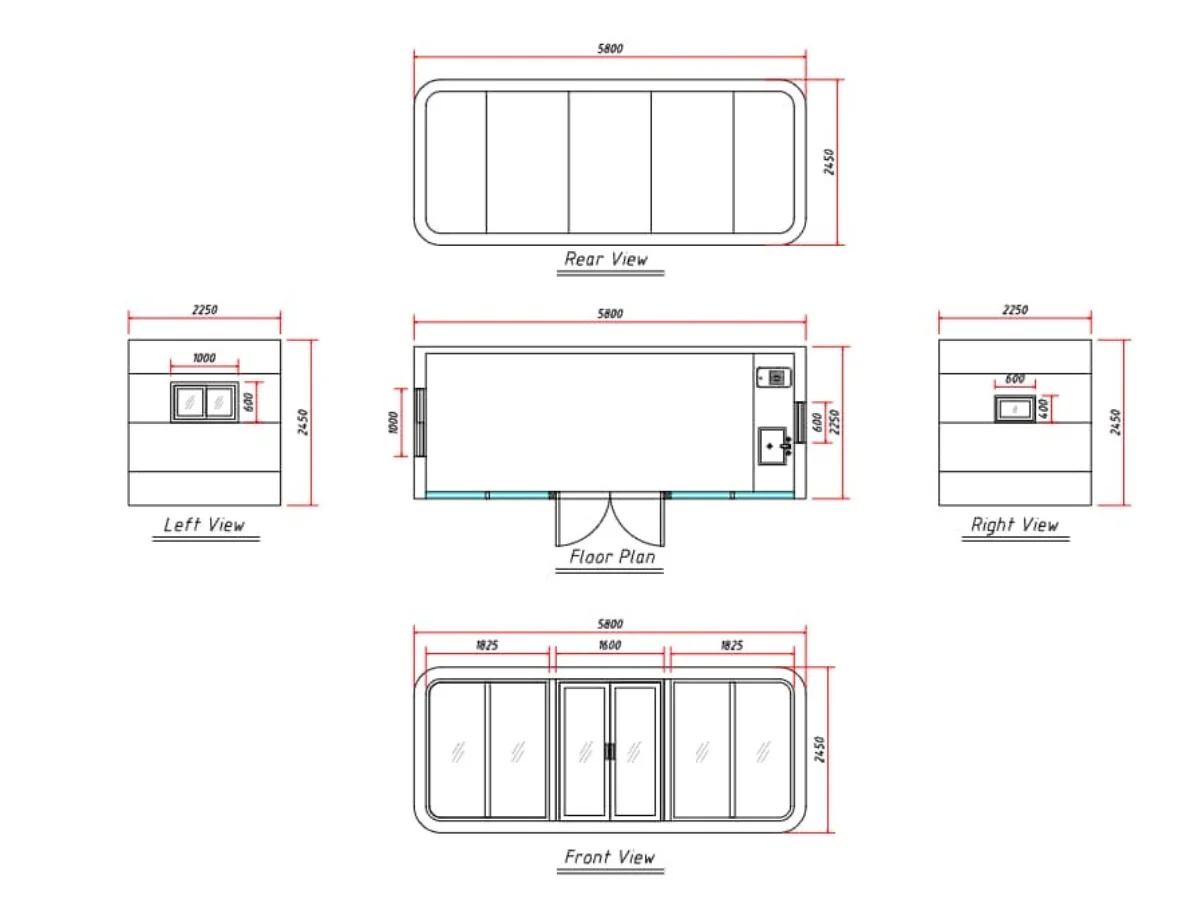 - H 2450 × W 2250 × L 5800 mm
